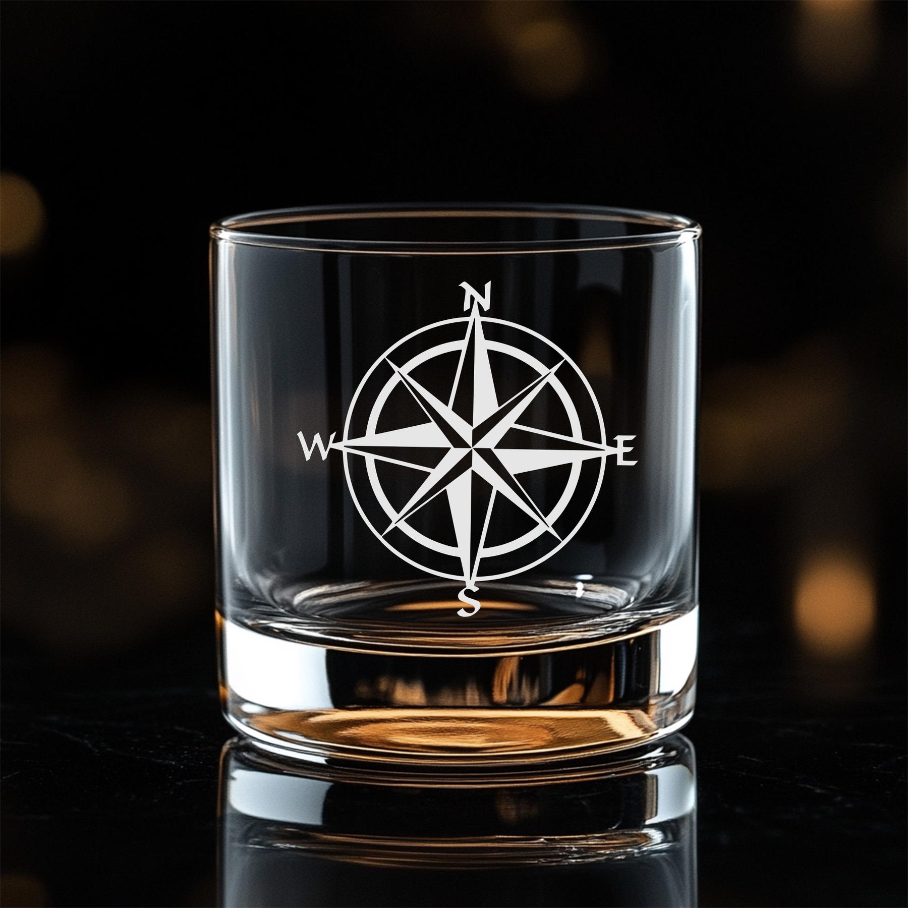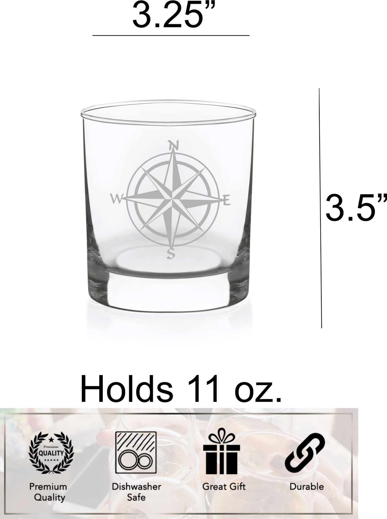 Elevate your drinking experience with this sophisticated 11 oz whiskey glass, featuring a unique laser-etched nautical compass design. Crafted from clear, high-quality glass, it beautifully displays your favorite spirits, cocktails, or other beverages. The durable construction and comfortable grip make it perfect for both everyday use and special occasions, while the 11-ounce capacity provides ample room for ice and mixers. This practical glass is also top-rack dishwasher safe for easy cleaning, making it a great addition to any home bar or glassware collection.